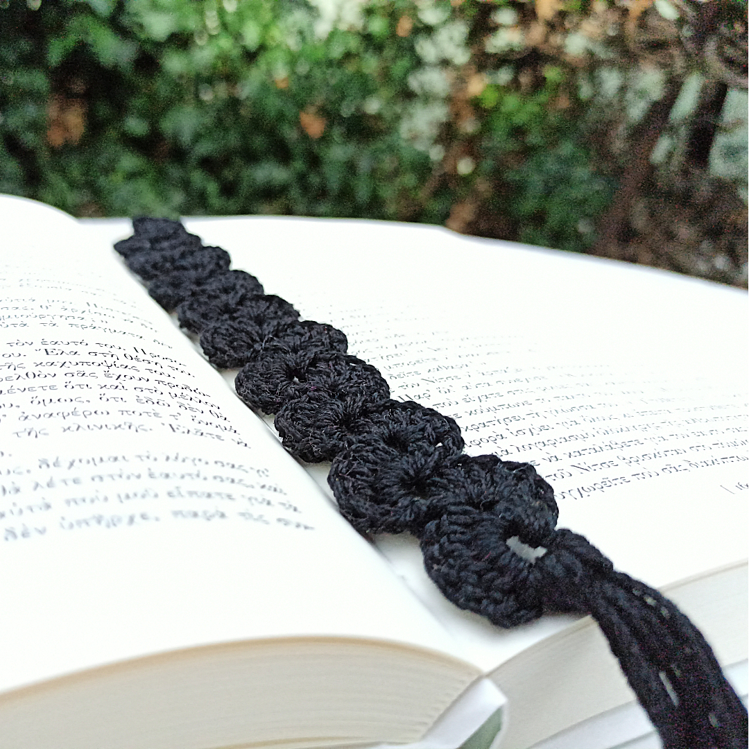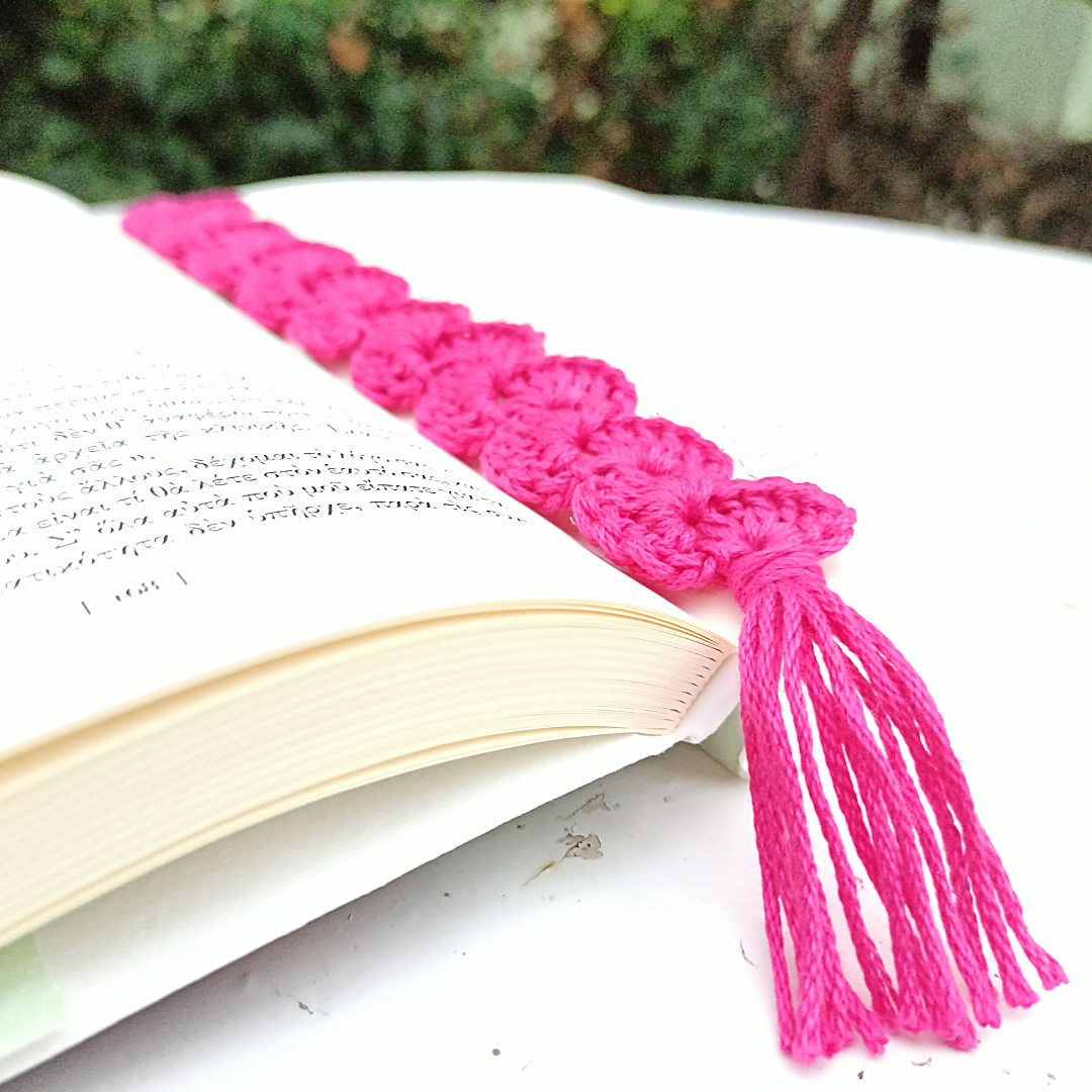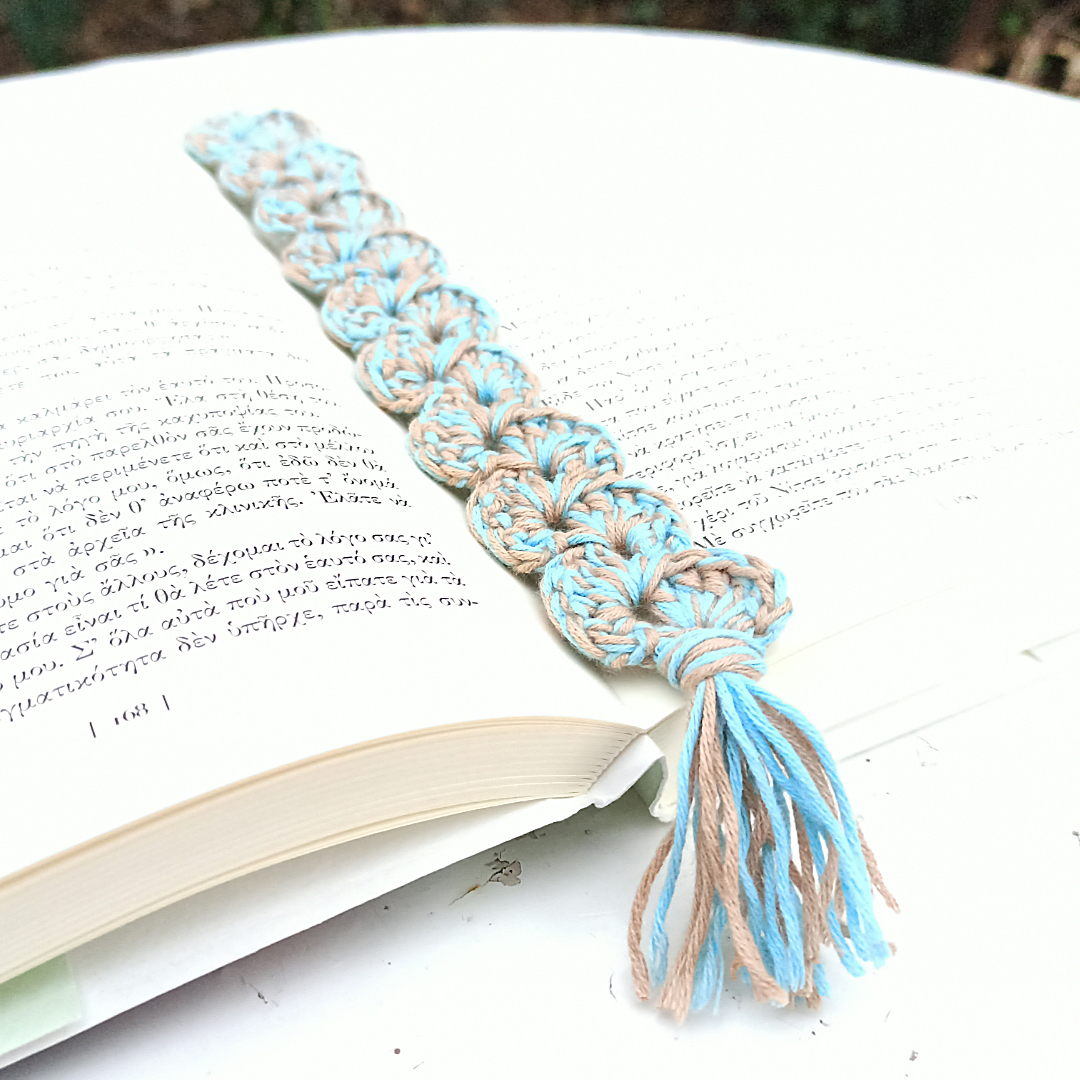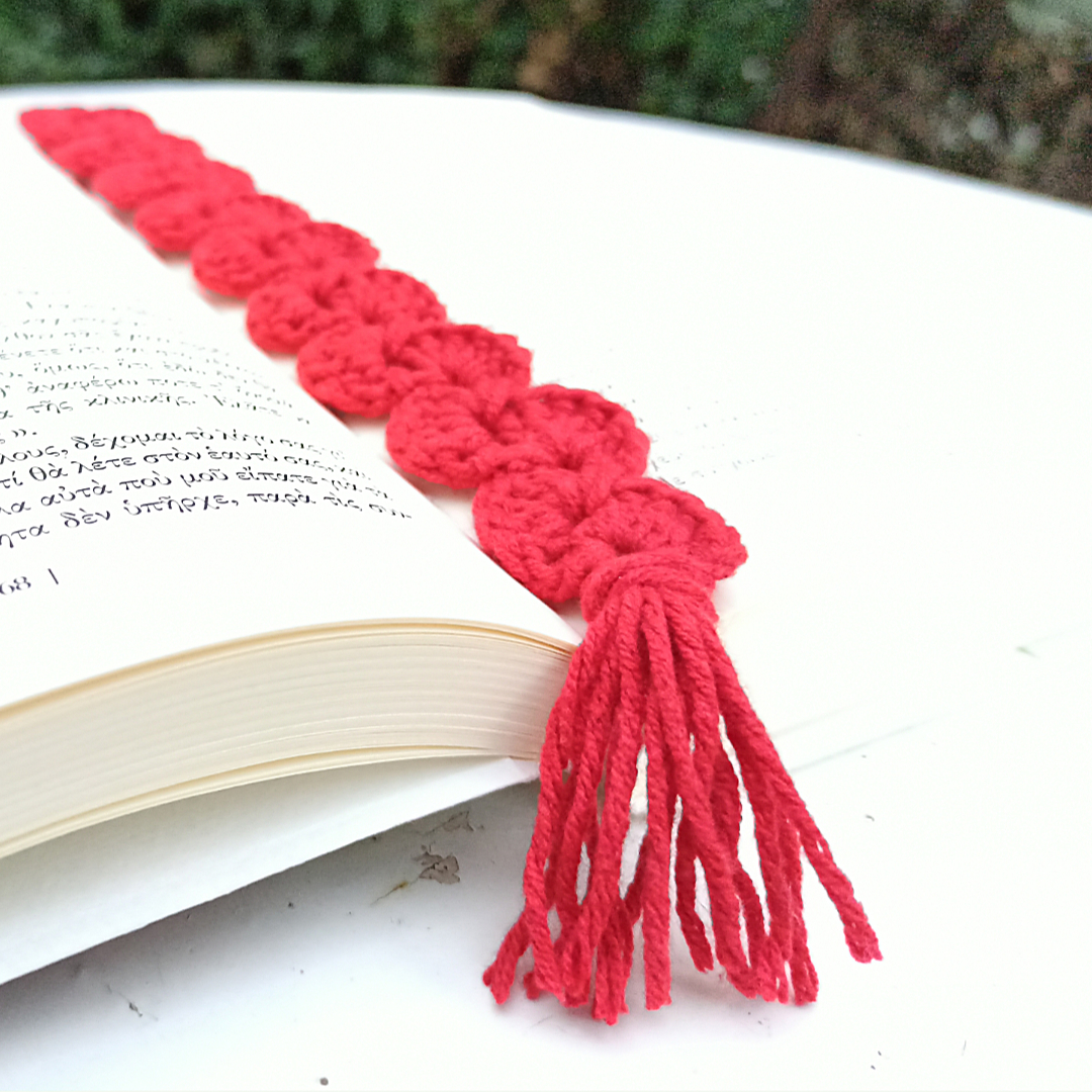 Πλεκτός σελιδοδείκτης με φούντα στο τελείωμα.