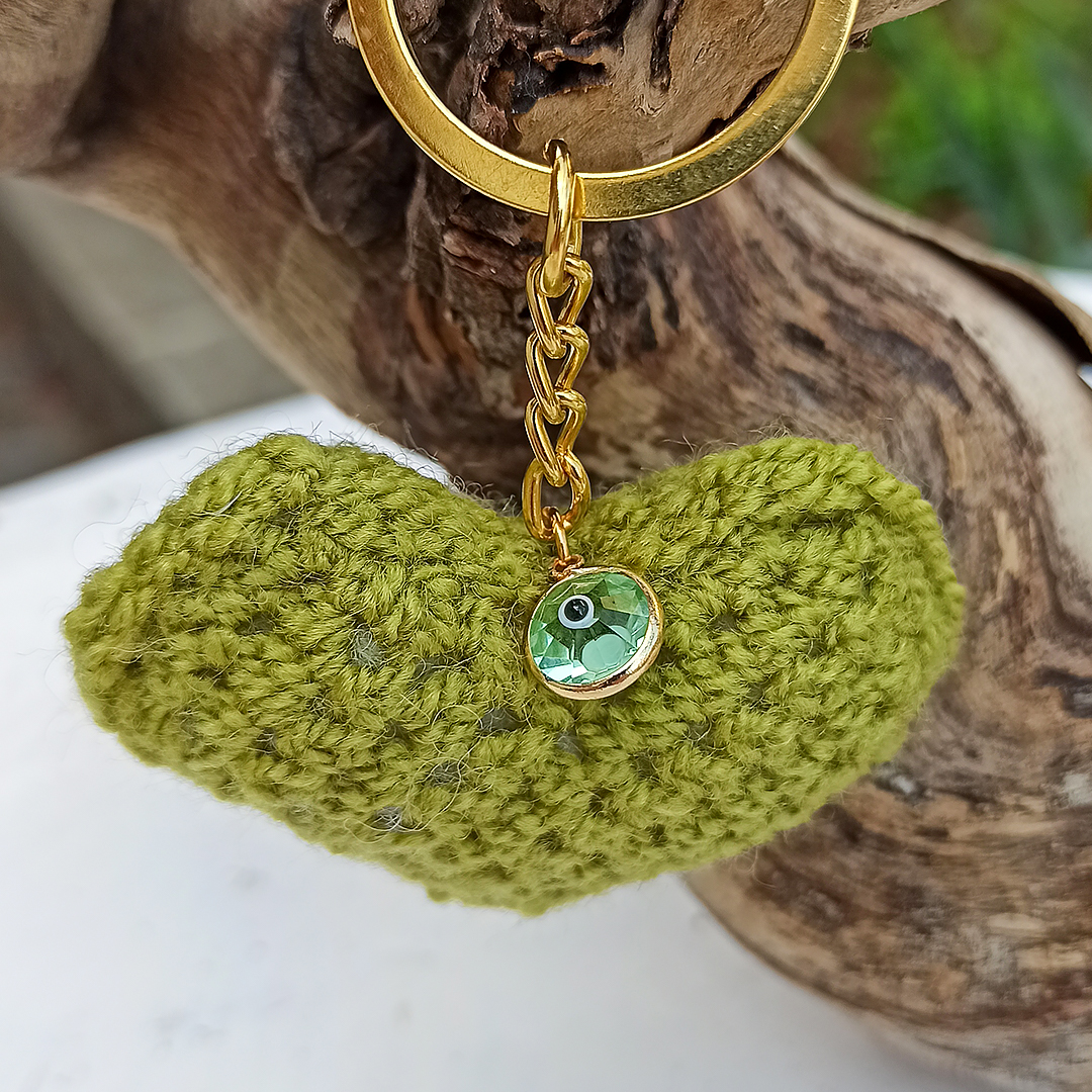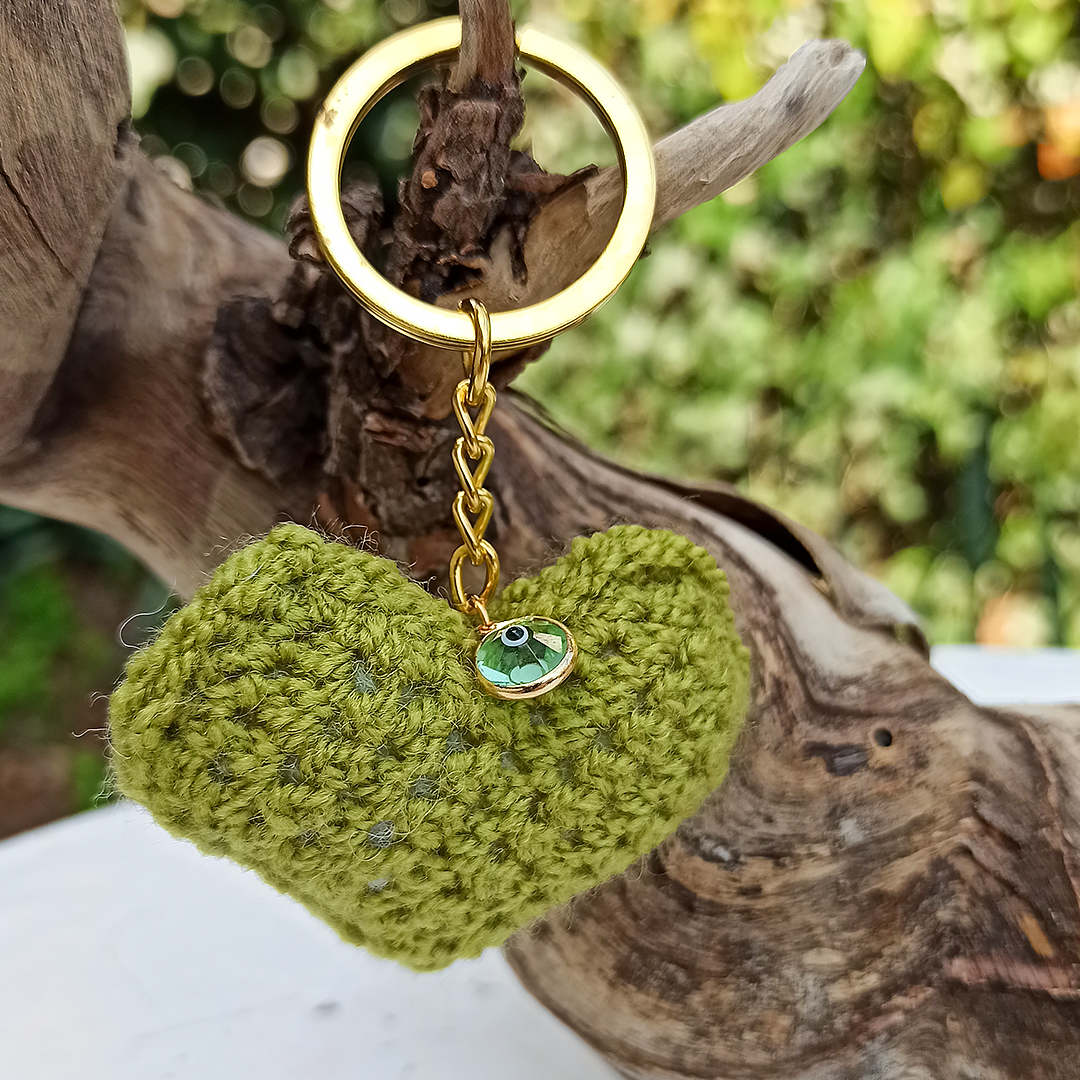 Πλεκτή καρδιά μπρελόκ σε λαχανί* χρώμα με ματάκι.