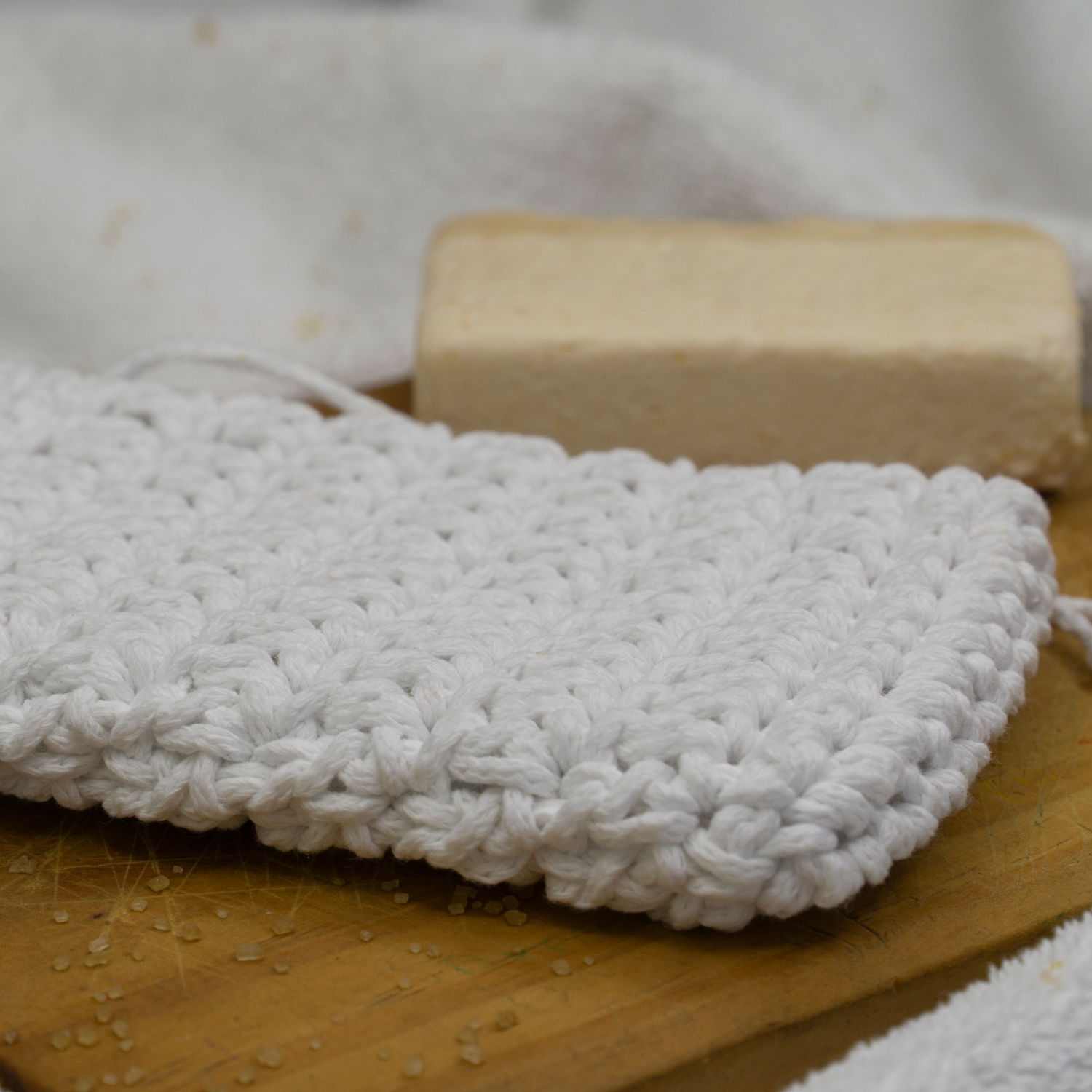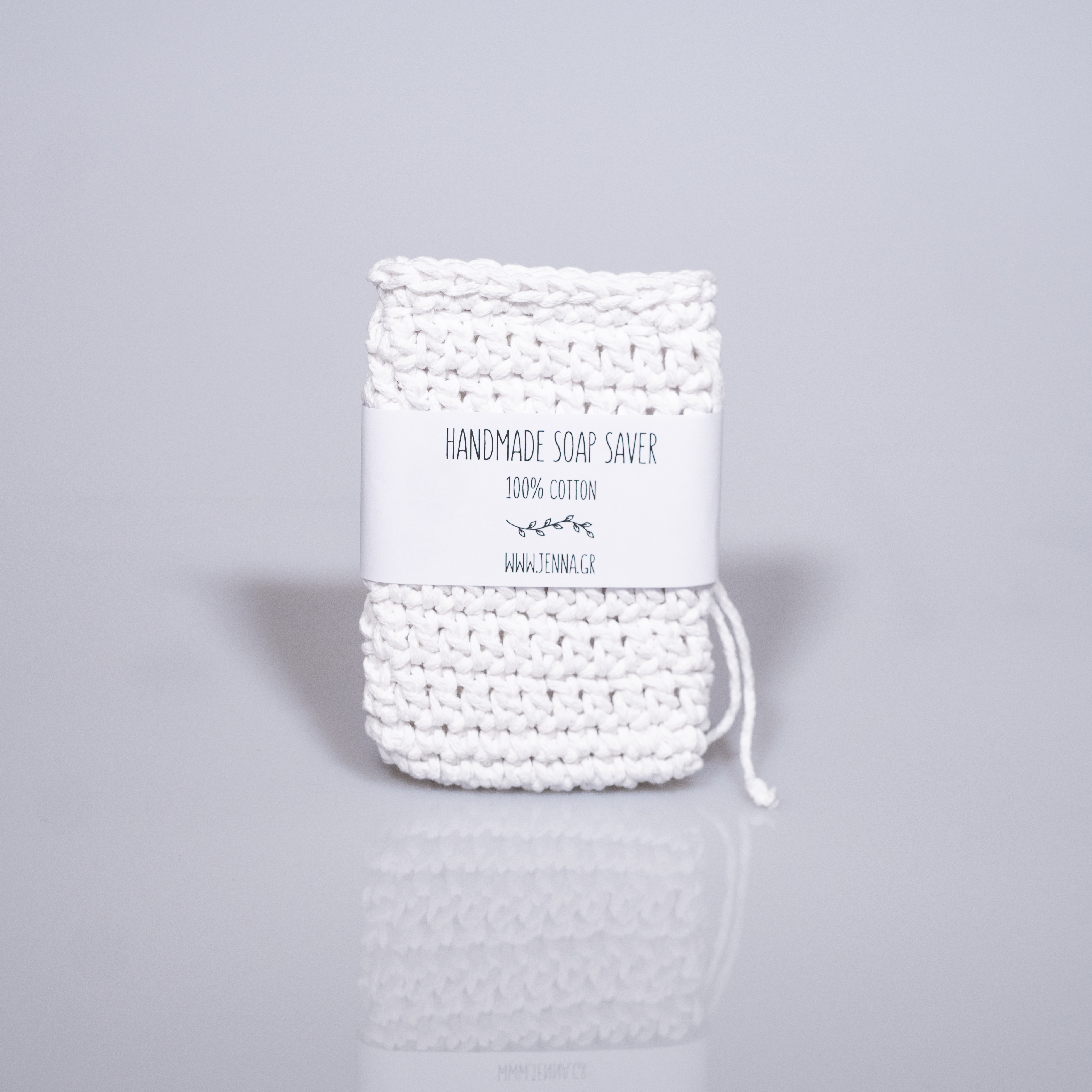Χειροποίητη πλεκτή θήκη σαπουνιού σε λευκό χρώμα από 100% βαμβακερό νήμα, σχεδιασμένη για χρήση στο σώμα αλλά και στο πρόσωπο.